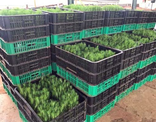Entrega de pinus - uma carga de mudas de pinus prontas para entrega. As plantas no sistema Ellepot podem ser entregues em campo sem as bandejas, reduzindo os desafios logísticos em devolvê-las aos viveiros.