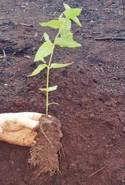 Transplantio de E.dunnii - a redução de choque no transplante leva a um desenvolvimento radicular mais rápido e à consolidação no plantio. Nesta foto temos um exemplo do desenvolvimento radicular da muda do Eucalyptus dunnii em Ellepot, 5 dias após o plantio em campo.